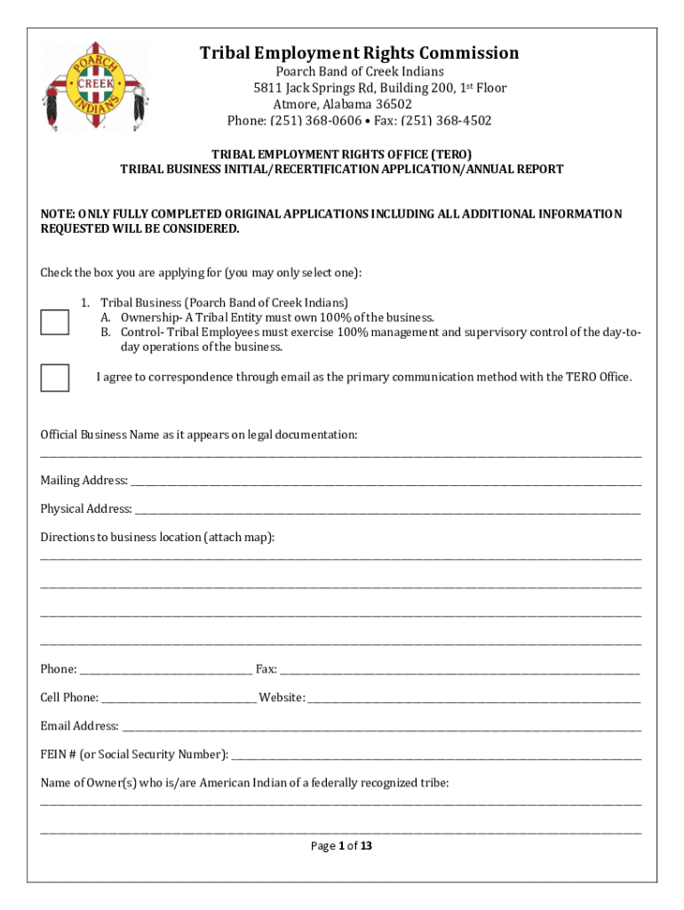 Tribal Employment Rights Commission Porch Band of Creek Indians 5811 Jack Springs Rd, Building 200, 1st Floor At more, Alabama 36502 Phone: (251× 3680606 Fax: (251× 3684502 TRIBAL EMPLOYMENT RIGHTS