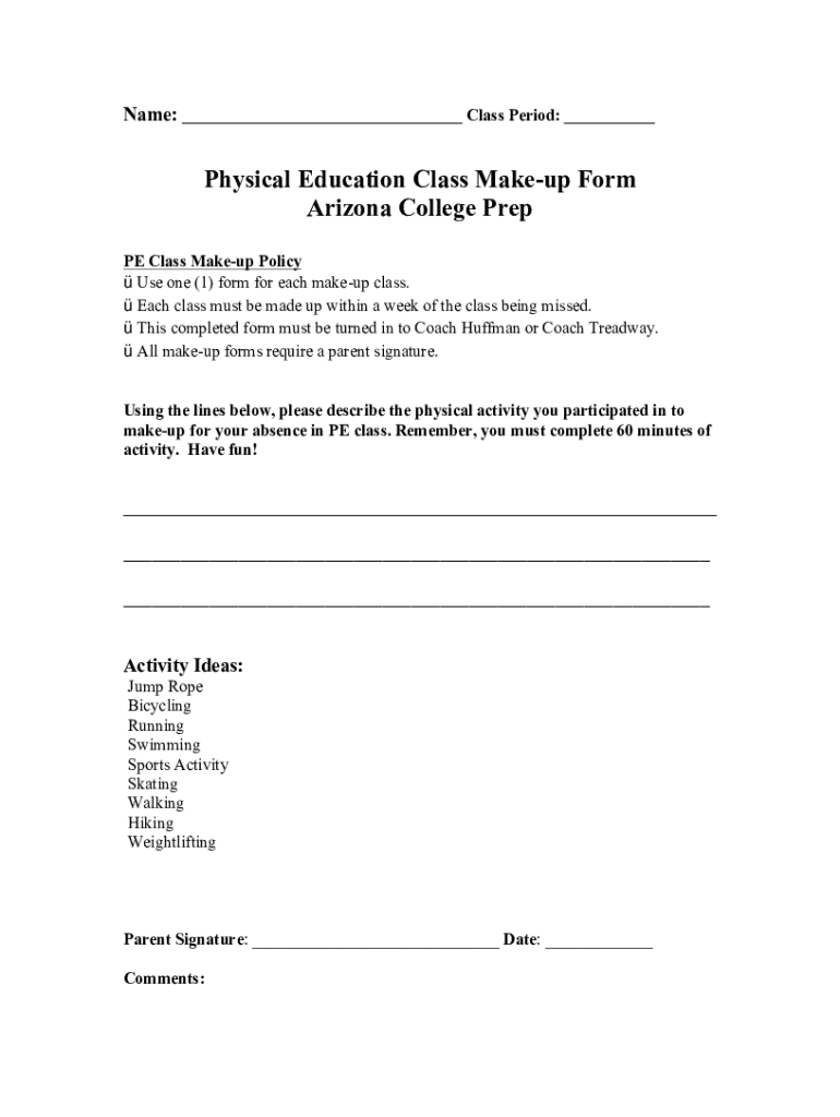 Name: ___ Class Period: ___Physical Education Class Makeup Form Arizona College Prep PE Class Makeup Policy Use one (1) form for each makeup class. Each class must be made up within a week of the