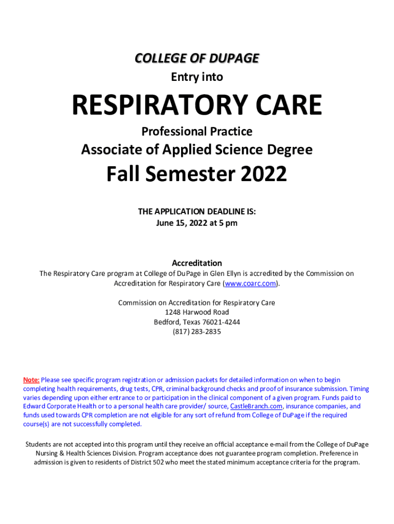 COLLEGE OF DUPAGE Entry intoRESPIRATORY CARE Professional PracticeAssociate of Applied Science DegreeFall Semester 2022 THE APPLICATION DEADLINE IS: June 15, 2022, at 5 accreditation The Respiratory
