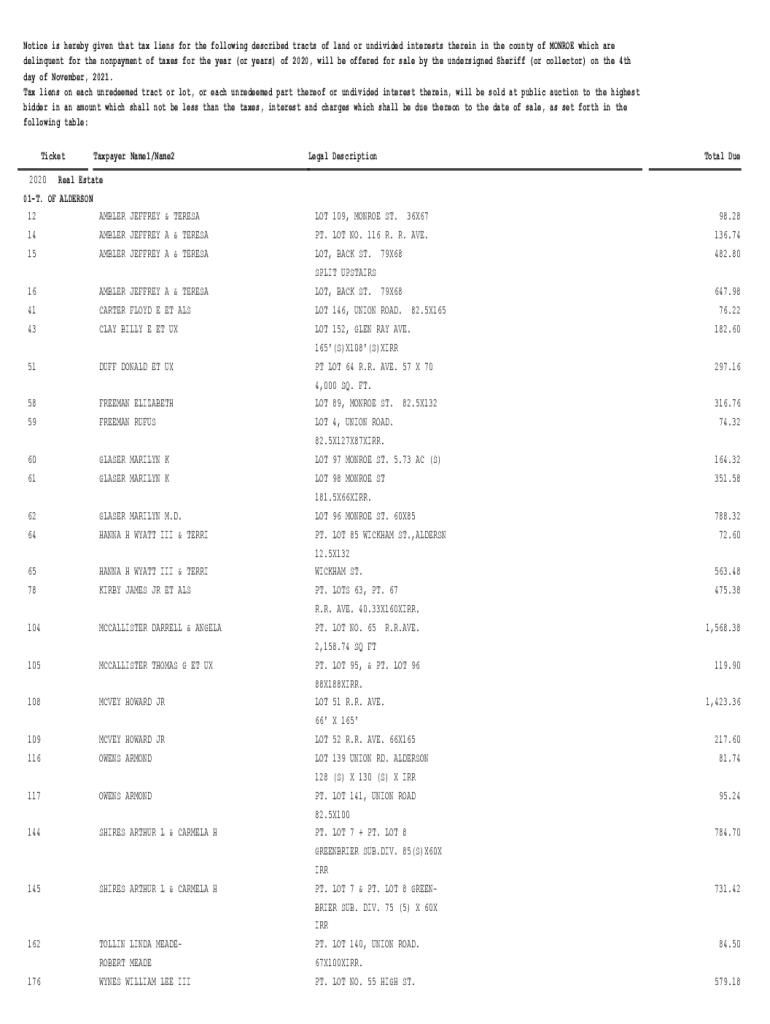 Notice is hereby given that tax liens for the following described tracts of land or undivided interests therein in the county of MONROE which are delinquent for the nonpayment of taxes for the year
