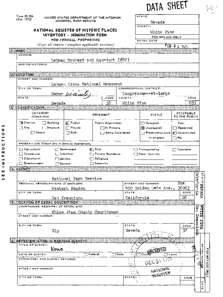 DATA SHEET Form 10306 (Oct. 1972×UNITED STATES DEPARTMENT OF THE INTERIOR NATIONAL PARK SERVICENevadaNATIONAL REGISTER OF HISTORIC PLACES INVENTORY NOMINATION FORM White Pine FOR NPS USE ONLY FEDERAL