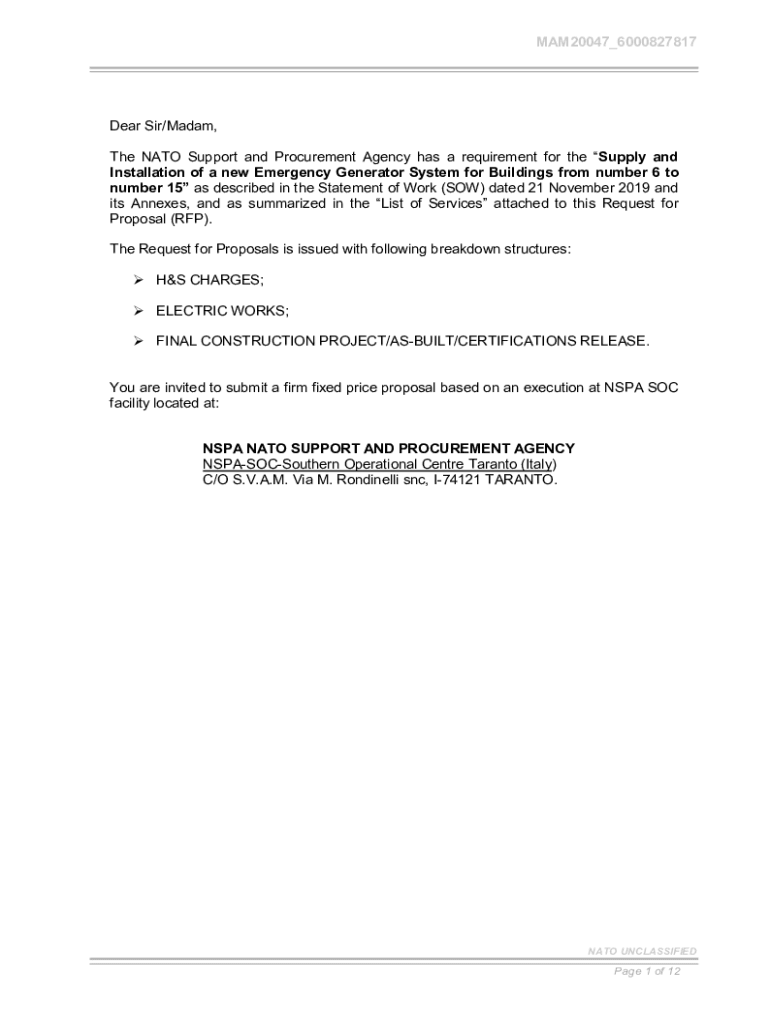 MAM20047×6000827817Dear Sir×Madam, The NATO Support and Procurement Agency has a requirement for the Supply and Installation of a new Emergency Generator System for Buildings from number 6 to number