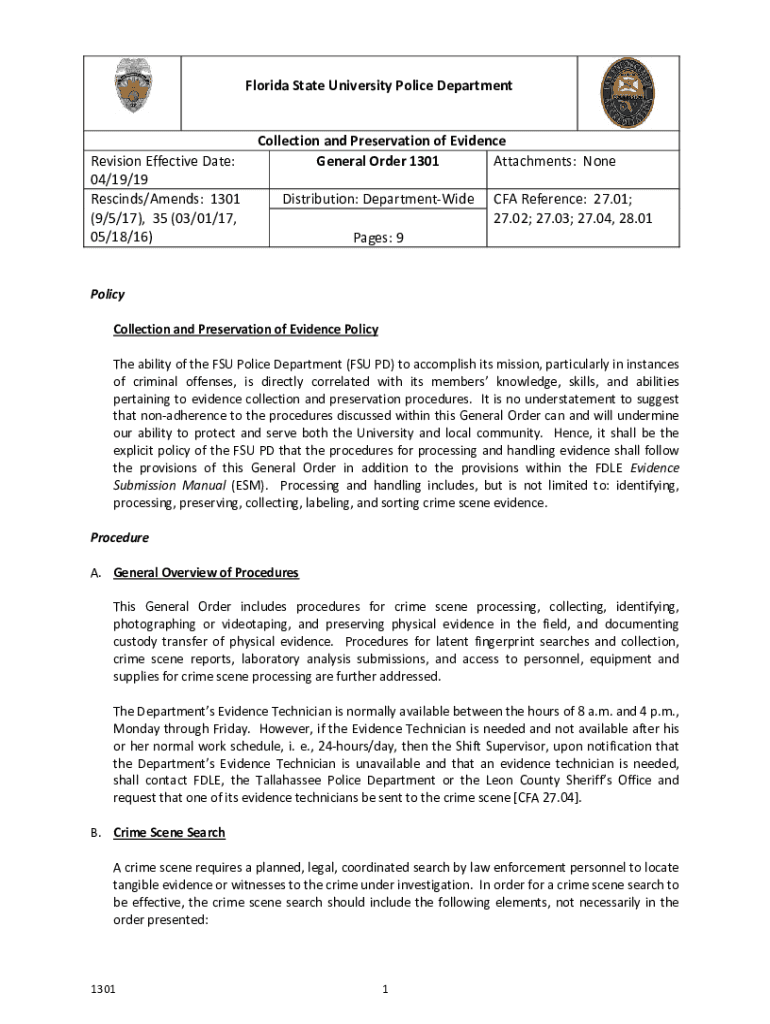 FloridaStateUniversityPoliceDepartment RevisionEffectiveDate: 04×19/19 Rescinds×Amends:1301 ×9×5×17),35×03/01×17, 05×18/16) CollectionandPreservationofEvidence GeneralOrder1301 Attachments:None