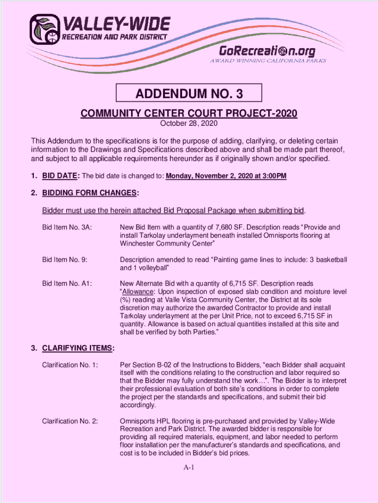 ADDENDUM NO. 3 COMMUNITY CENTER COURT PROJECT2020 October 28, 2020, This Addendum to the specifications is for the purpose of adding, clarifying, or deleting certain information to the Drawings and