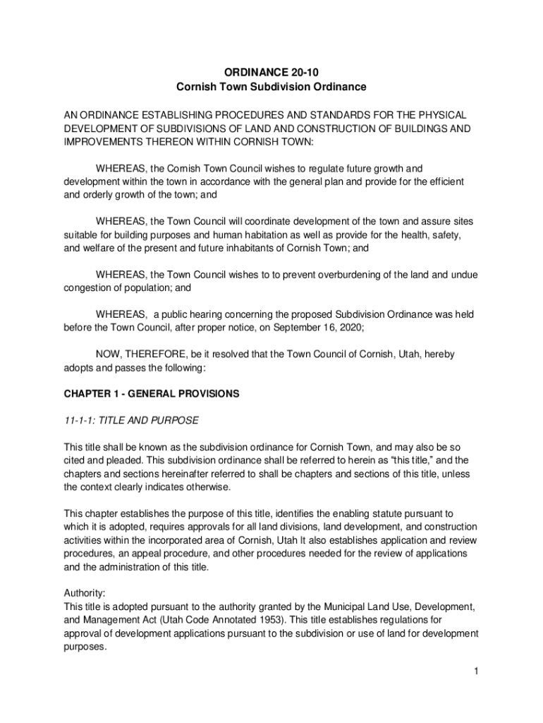 ORDINANCE 2010 Cornish Town Subdivision Ordinance AN ORDINANCE ESTABLISHING PROCEDURES AND STANDARDS FOR THE PHYSICAL DEVELOPMENT OF SUBDIVISIONS OF LAND AND CONSTRUCTION OF BUILDINGS AND IMPROVEMENTS
