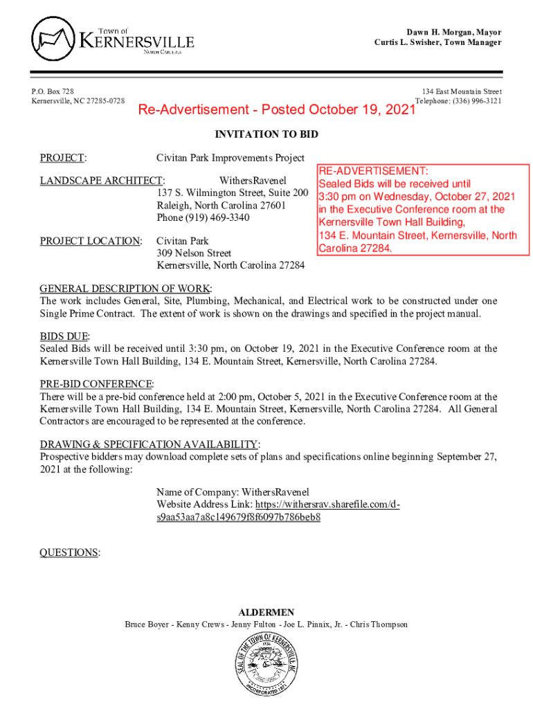 Dawn H. Morgan, Mayor Curtis L. Swisher, Town Manager. O. Box 728 Kernersville, NC 272850728134 East Mountain Street Telephone: (336) 9963121ReAdvertisement Posted October 19, 2021, INVITATION TO