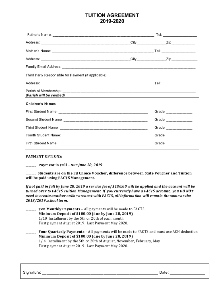 TUITION AGREEMENT 20192020 Fathers Name: ___ Tel: ___ Address: ___City___Zip___ Mothers Name: ___ Tel: ___ Address: ___City___Zip___ Family Email Address: ___ Third Party Responsible for Payment (if