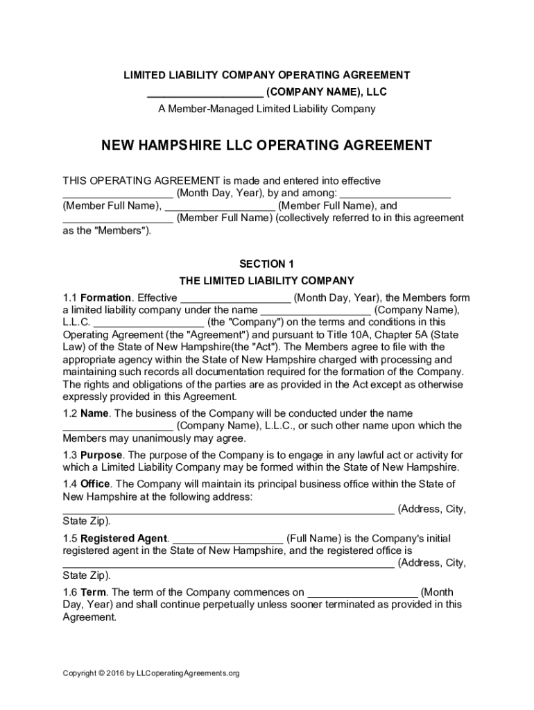 LIMITED LIABILITY COMPANY OPERATING AGREEMENT ___ (COMPANY NAME×, LLC A MemberManaged Limited Liability Company HAMPSHIRE LLC OPERATING AGREEMENT THIS OPERATING AGREEMENT is made and entered into