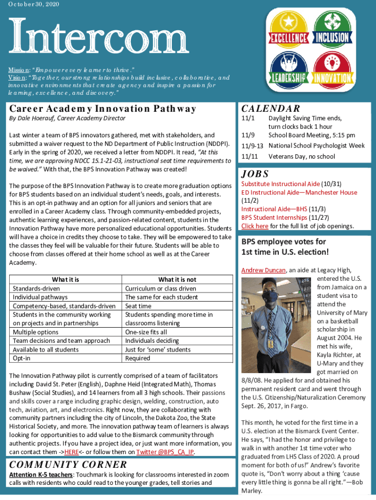 October 30, 2020IntercomMission: Empower every learner to thrive. Vision: Together, our strong relationships build inclusive, collaborative, and innovative environments that create agency and inspire