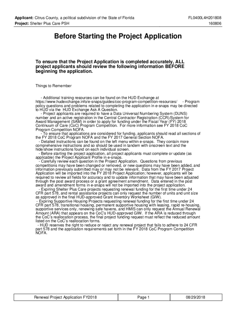 Applicant: Citrus County, a political subdivision of the State of Florida Project: Shelter Plus Care PSHFL0400L4H201808 160806Before Starting the Project Application ensure that the Project Application