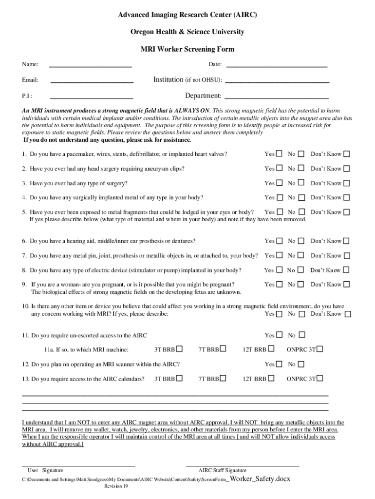 Advanced Imaging Research Center (AIR) Oregon Health & Science University MRI Worker Screening Form Name:___Date: ___Email:___Institution (if not OSU): ___P. I :___Department: ___An MRI instrument