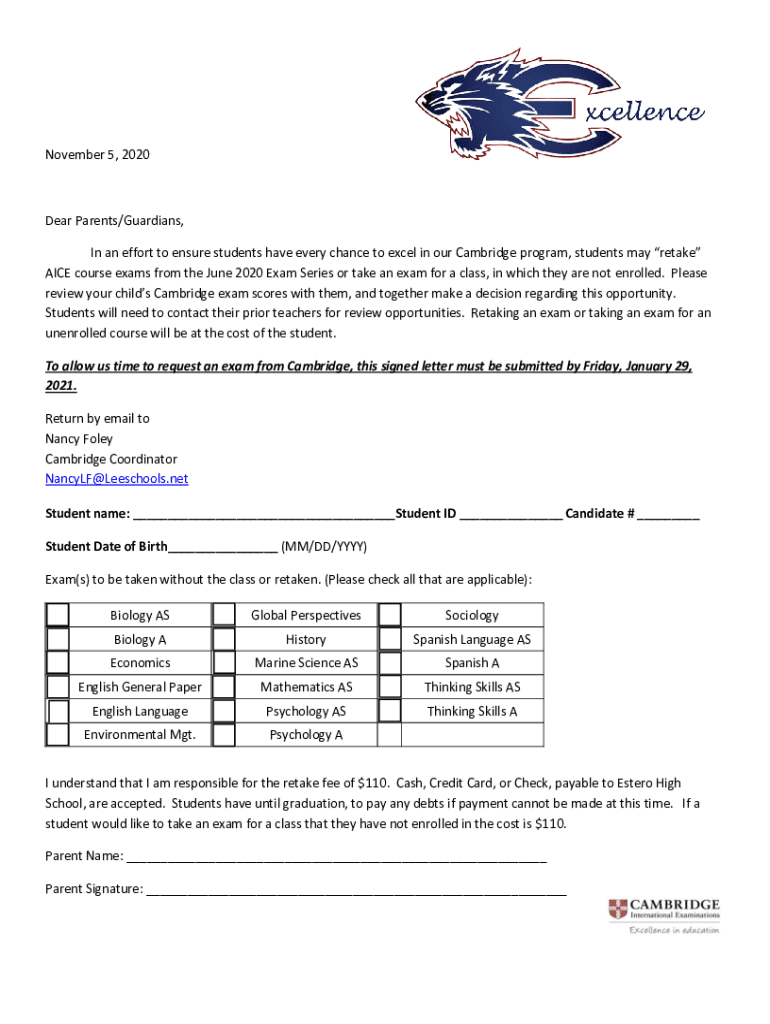November 5, 2020Dear Parents×Guardians, In an effort to ensure students have every chance to excel in our Cambridge program, students may retake NICE course exams from the June 2020 Exam Series or