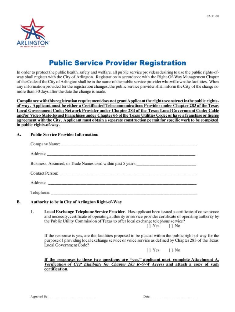 033120Public Service Provider Registration In order to protect the public health, safety and welfare, all public service providers desiring to use the public rightsofway shall register with the City