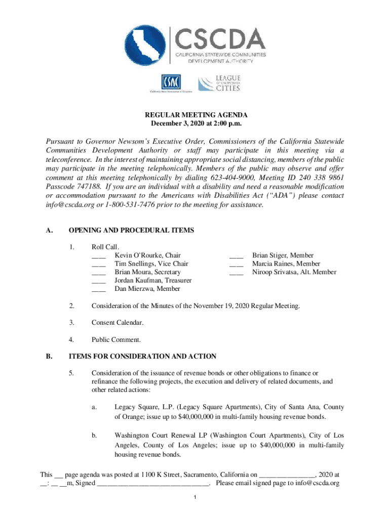 REGULAR MEETING AGENDA December 3, 2020, at 2:00 p.m. Pursuant to Governor News oms Executive Order, Commissioners of the California Statewide Communities Development Authority or staff may participate