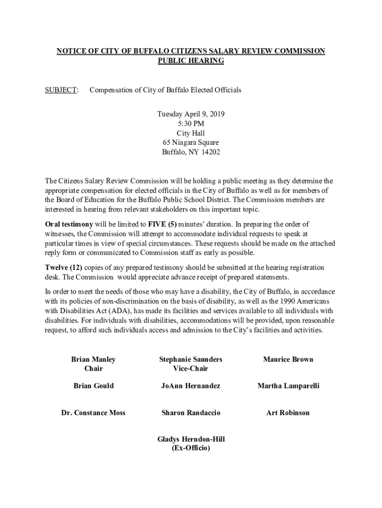 NOTICE OF CITY OF BUFFALO CITIZENS SALARY REVIEW COMMISSION PUBLIC HEARING SUBJECT:Compensation of City of Buffalo Elected Officials Tuesday, April 9, 2019 5:30 PM City Hall 65 Niagara Square Buffalo,