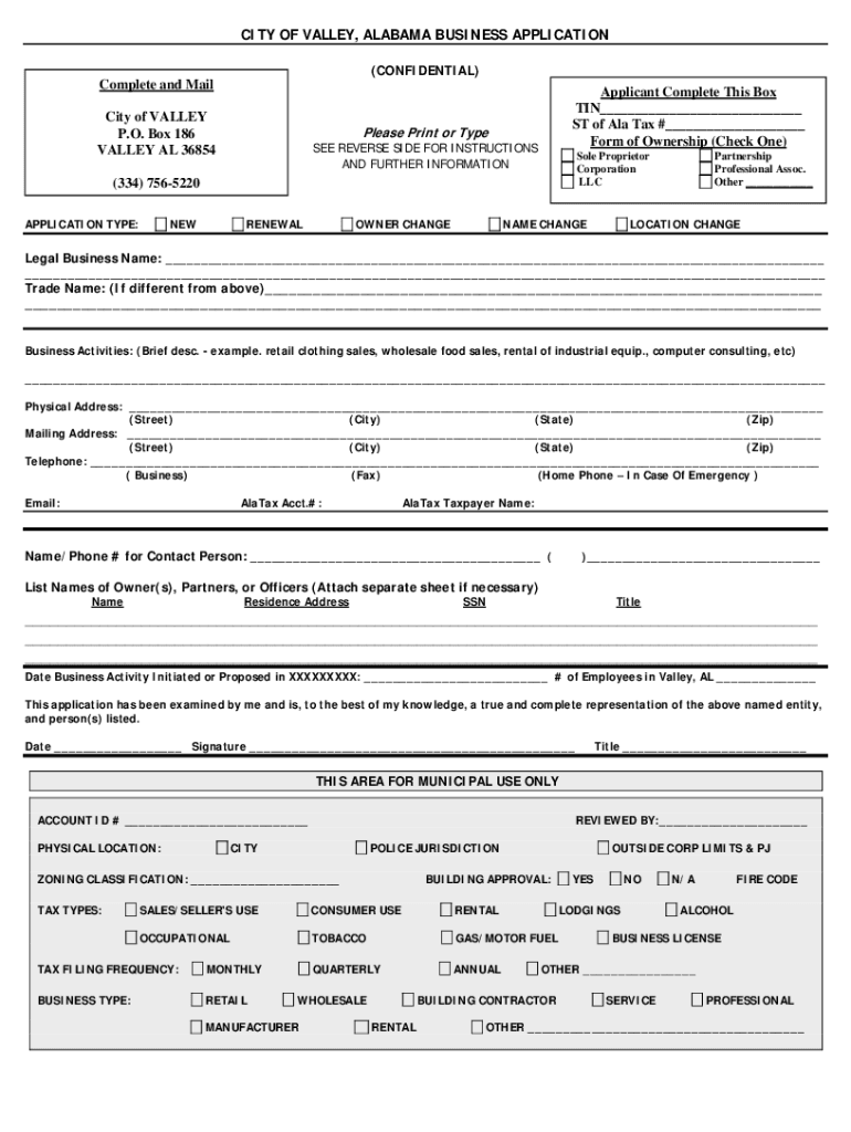 CITY OF VALLEY, ALABAMA BUSINESS APPLICATION (CONFIDENTIAL×Complete and Mail City of VALLEY P.O. Box 186 VALLEY AL 36854Applicant Complete This Box TIN___ ST of Ala Tax #___ Form of Ownership (Check