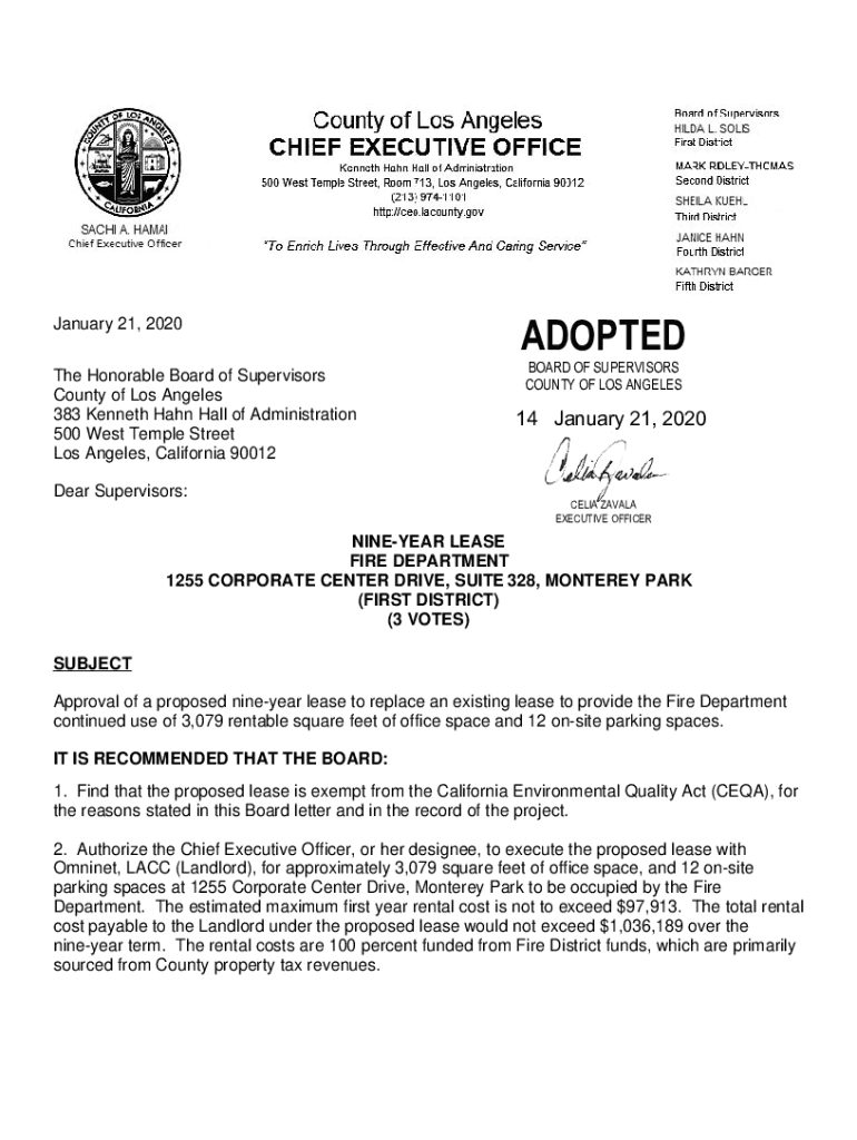 January 21, 2020, The Honorable Board of Supervisors County of Los Angeles 383 Kenneth Hahn Hall of Administration 500 West Temple Street Los Angeles, California 90012 Dear Supervisors:ADOPTED BOARD