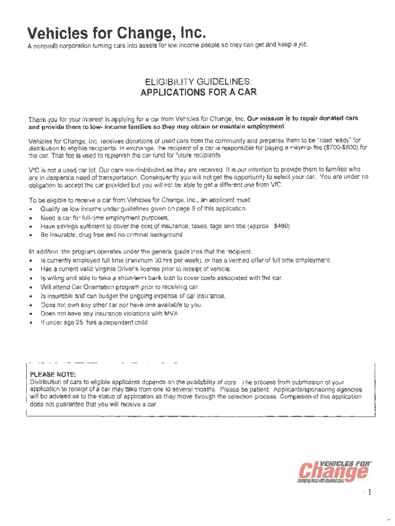 Vehicles for Change, Inc. A nonprofit corporation turning cars into assets for low income people, so they can get and keep a job. ELIGIBILITY GUIDELINES: APPLICATIONS FOR A CAR Thank you for your