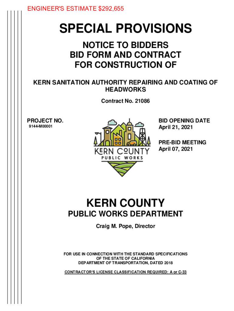 ENGINEER\'S ESTIMATE $292,655SPECIAL PROVISIONS NOTICE TO BIDDERS BID FORM AND CONTRACT FOR CONSTRUCTION OF KERN SANITATION AUTHORITY REPAIRING AND COATING OF HEADWORDS Contract No. 21086PROJECT NO.BID