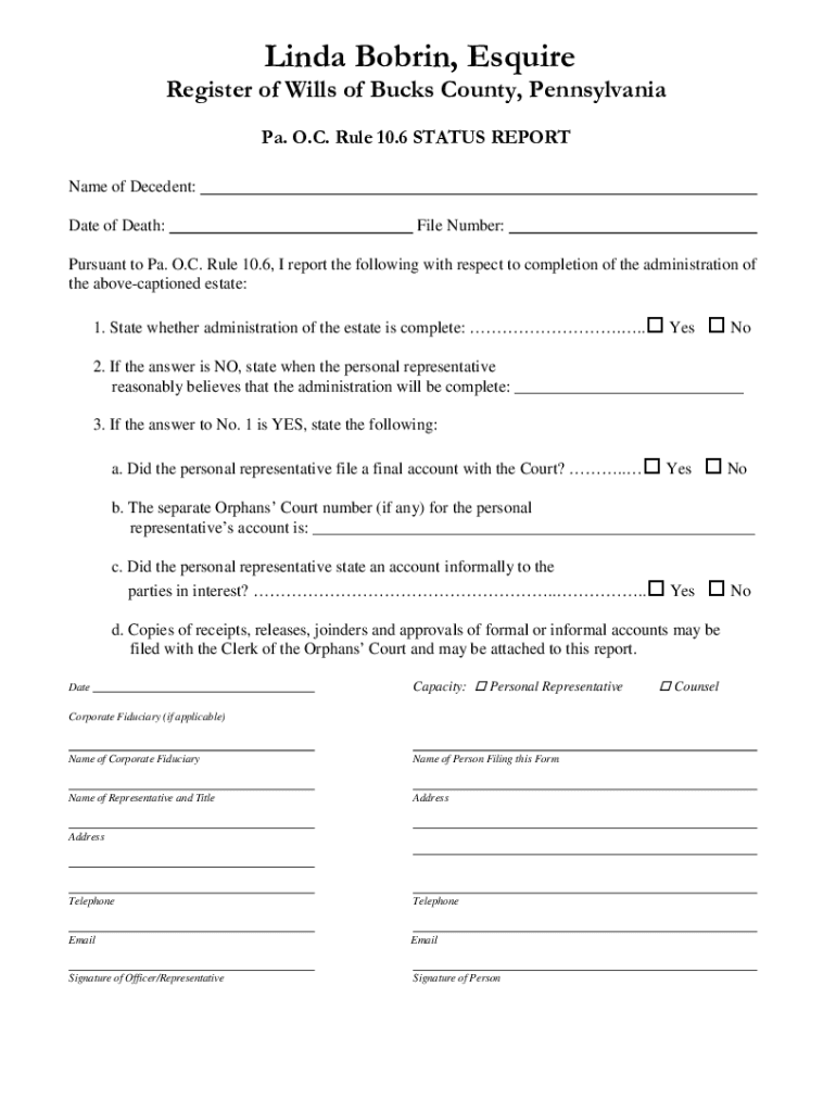 Linda Bobbin, EsquireRegister of Wills of Bucks County, Pennsylvania Pa. O.C. Rule 10.6 STATUS REPORT Name of Decedent: Date of Death:File Number:Pursuant to Pa. O.C. Rule 10.6, I report the following