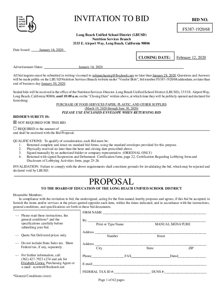 INVITATION TO BID NO. FS3871920×68Long Beach Unified School District (LB USD) Nutrition Services Branch 3333 E. Airport Way, Long Beach, California 90806 Date Issued:January 16, 2020CLOSING DATE: