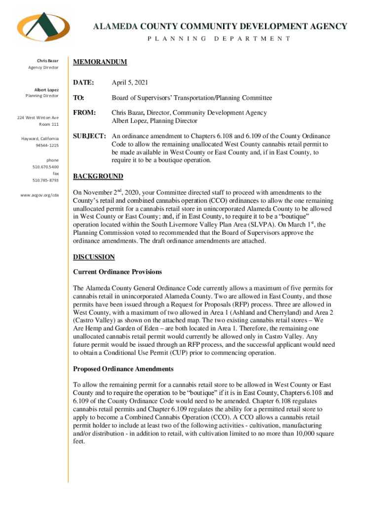 ALAMEDA COUNTY COMMUNITY DEVELOPMENT AGENCY P L A N N I NG Chris Bazaar Agency Director Albert Lopez Planning Director224 West Winston Ave Room 111 Hayward, California 945441215 phone 510.670.5400