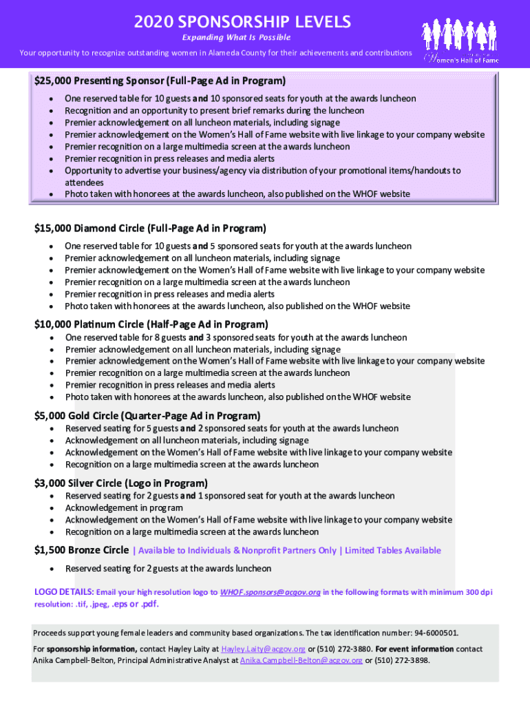 2020 SPONSORSHIP LEVELS Expanding What Is PossibleYour opportunity to recognize outstanding women in Alameda County for their achievements and contributions×25,000 Presenting Sponsor (Full Page Ad