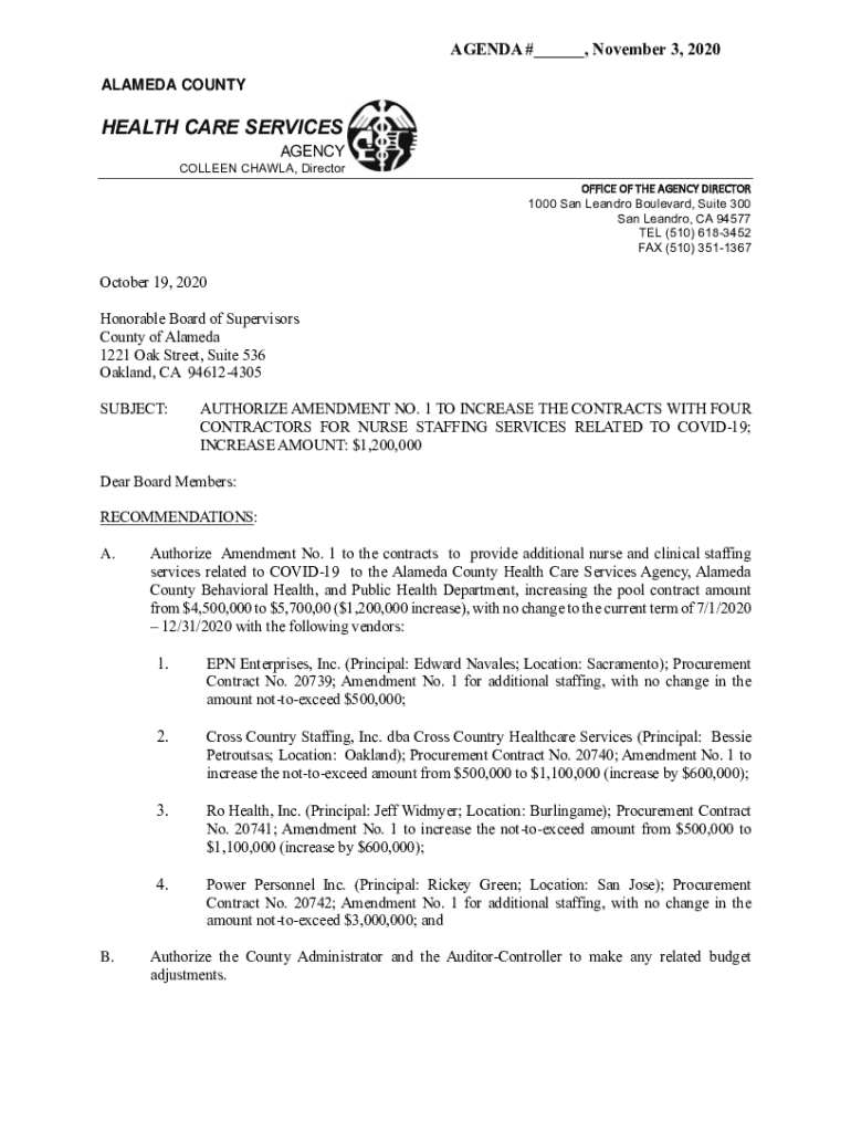 AGENDA #___, November 3, 2020, ALAMEDA COUNTYHEALTH CARE SERVICES AGENCY COLLEEN CHALK, Director OFFICE OF THE AGENCY DIRECTOR 1000 San Leandro Boulevard, Suite 300 San Leandro, CA 94577 TEL (510×