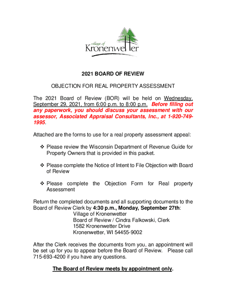 2021 BOARD OF REVIEW OBJECTION FOR REAL PROPERTY ASSESSMENT The 2021 Board of Review (FOR) will be held on Wednesday, September 29, 2021, from 6:00 p.m. to 8:00 p.m. Before filling out any paperwork,