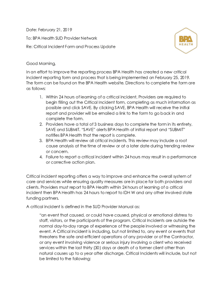 Date: February 21, 2019, To: BPA Health SUD Provider Network Re: Critical Incident Form and Process Update Good Morning, In an effort to improve the reporting process BPA Health has created a new