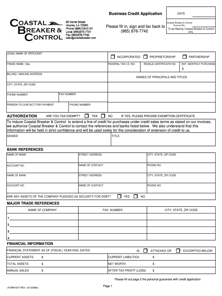 The Business Credit Application Form is a vendor registration document used by businesses to apply for a line of credit with Coastal Breaker & Control.
