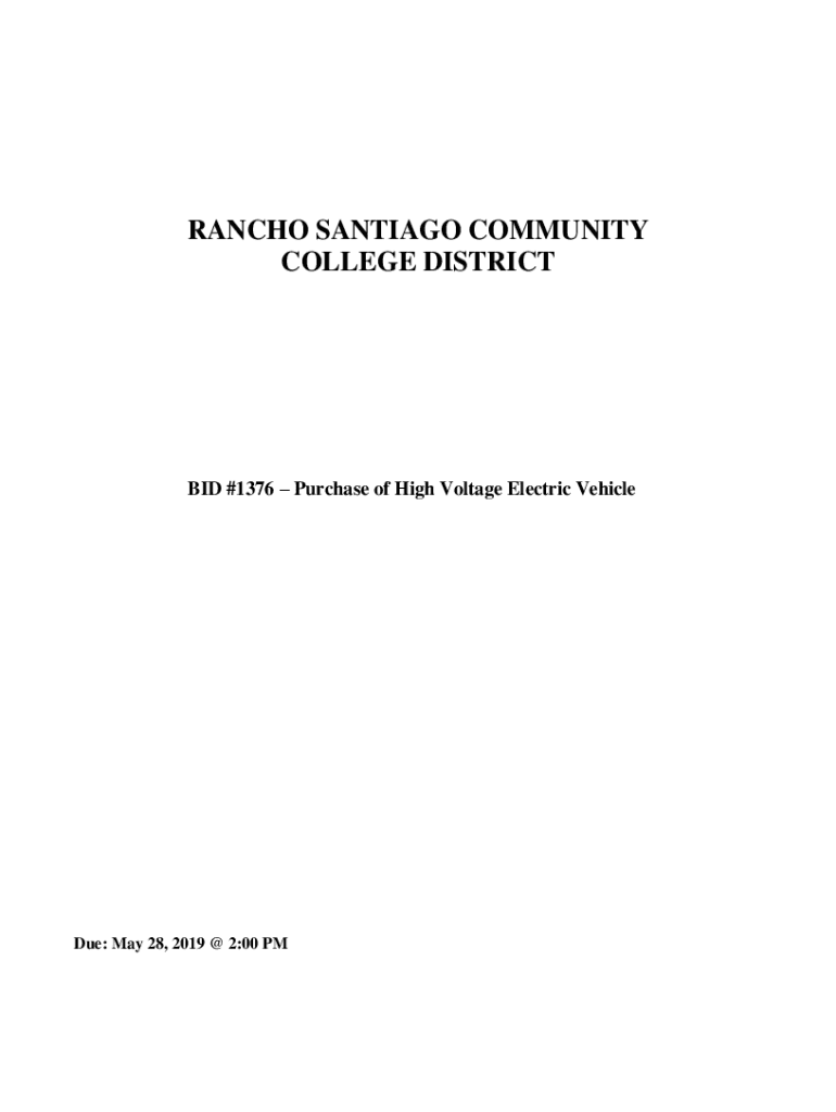 RANCHO SANTIAGO COMMUNITY COLLEGE DISTRICT BID #1376 Purchase of High Voltage Electric Vehicle: May 28, 2019 × 2:00 POTABLE OF CONTENTS Page Number Notice Calling for Bids1Information for Bidders2DrugFree