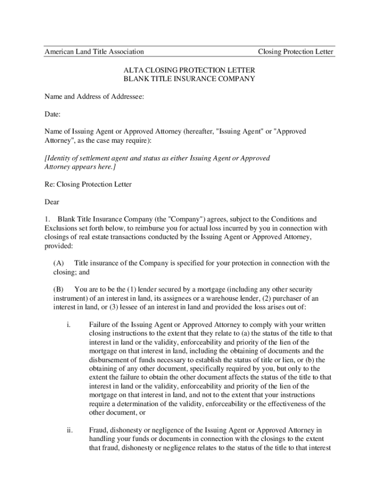 Get the free American Land Title Association Closing Protection Letter ALTA ...