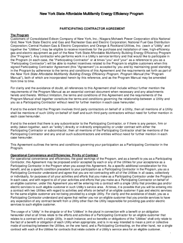 New York State Affordable Multifamily Energy Efficiency ProgramPARTICIPATING CONTRACTOR AGREEMENT The Program Customers of Consolidated Edison Company of New York, Inc.; Niagara Mohawk Power Corporation