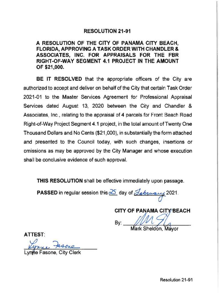 RESOLUTION 2191 A RESOLUTION OF THE CITY OF PANAMA CITY BEACH, FLORIDA, APPROVING A TASK ORDER WITH CHANDLER & ASSOCIATES, INC. FOR APPRAISALS FOR THE FOR RIGHTOFWAY SEGMENT 4.1 PROJECT IN THE AMOUNT
