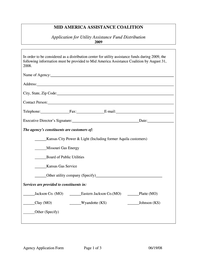 MID AMERICA ASSISTANCE COALITION Application for Utility Assistance Fund Distribution 2009 In order to be considered as a distribution center for utility assistance funds during 2009, the following