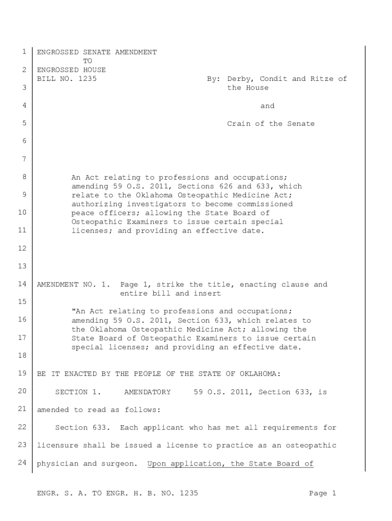 1 2ENGROSSED SENATE AMENDMENT TO ENGROSSED HOUSE BILL NO. 1235By: Derby, Conduit and Rite of the House3 4and5Crain of the Senate6 7 8 9 10 11An Act relating to professions and occupations; amending