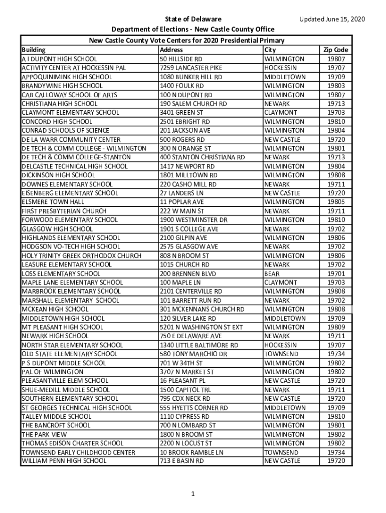 State of Delaware Department of Elections New Castle County Office New Castle County Vote Centers for 2020 Presidential PrimaryBuilding A DUPONT HIGH SCHOOL ACTIVITY CENTER AT HOSTESSING PAL APPOQUINIMINK