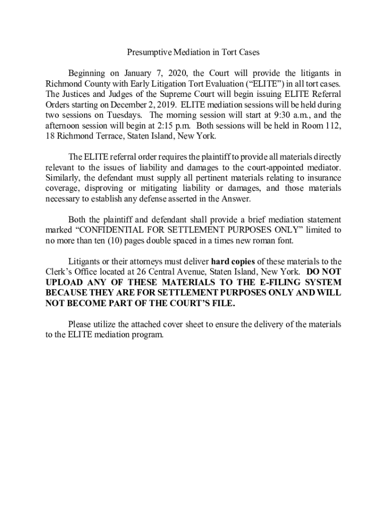 Presumptive Mediation in Tort Cases Beginning on January 7, 2020, the Court will provide the litigants in Richmond County with Early Litigation Tort Evaluation (ELITE) in all tort cases. The Justices