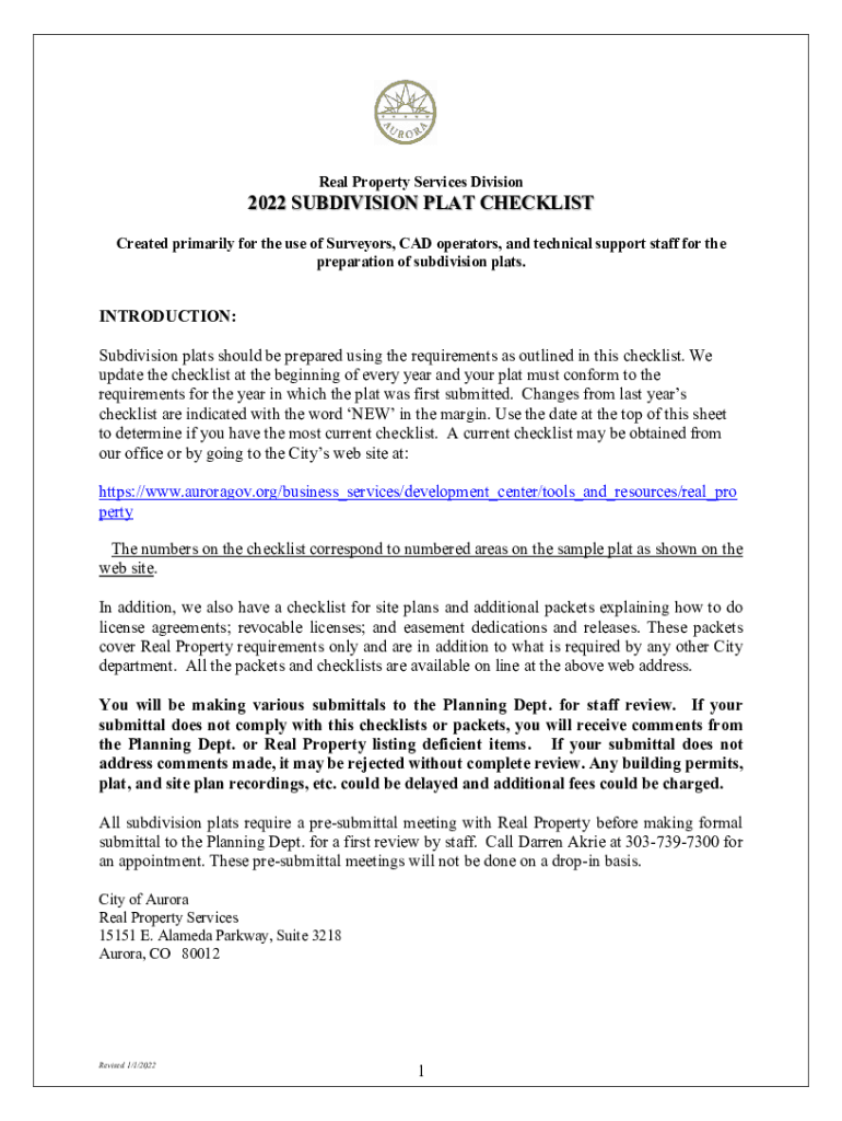 Real Property Services Division2022 SUBDIVISION PLAT CHECKLIST Created primarily for the use of Surveyors, CAD operators, and technical support staff for the preparation of subdivision plats.INTRODUCTION: