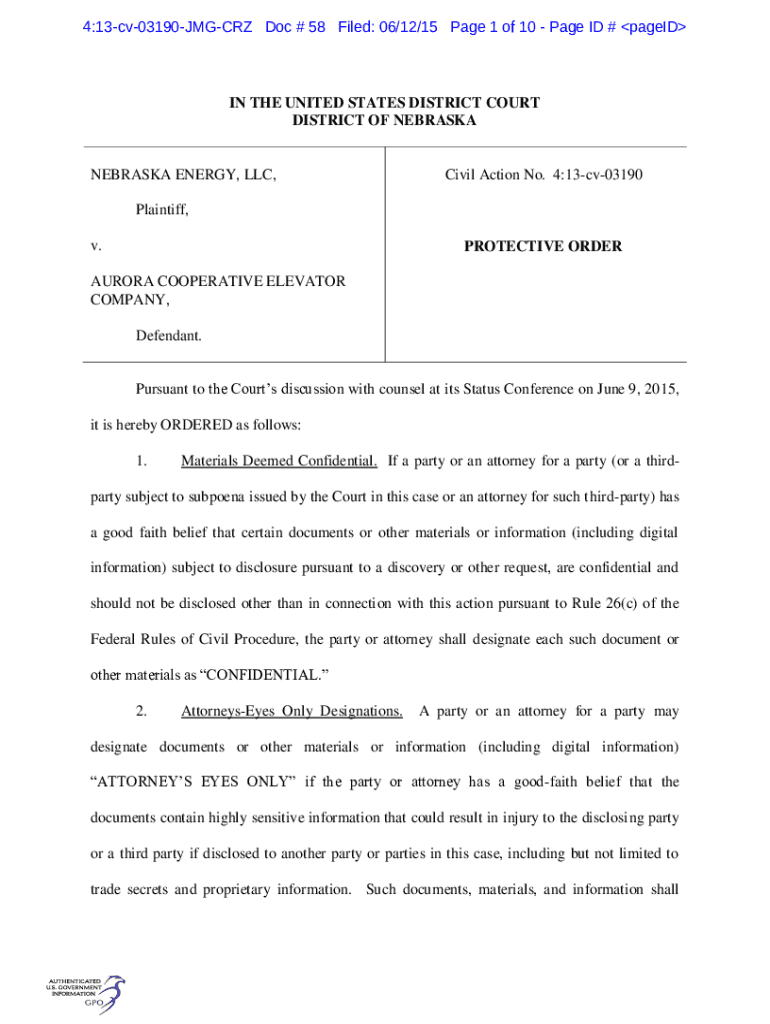 4:13cv03190JMGCRZ Doc # 58 Filed: 06×12/15-Page 1 of 10-Page ID # Poseidon THE UNITED STATES DISTRICT COURT DISTRICT OF NEBRASKANEBRASKA ENERGY, LLC, Civil Action No. 4:13cv03190Plaintiff, v.PROTECTIVE