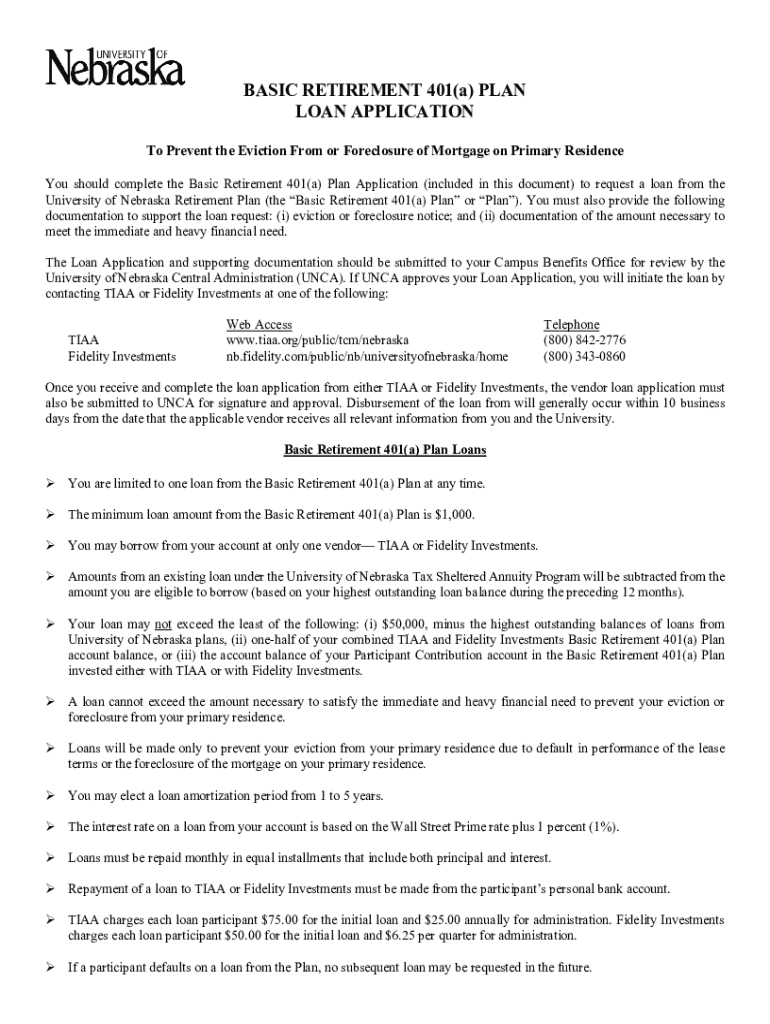 BASIC RETIREMENT 401×a) PLAN LOAN APPLICATION To Prevent the Eviction From or Foreclosure of Mortgage on Primary Residence You should complete the Basic Retirement 401×a) Plan Application (included