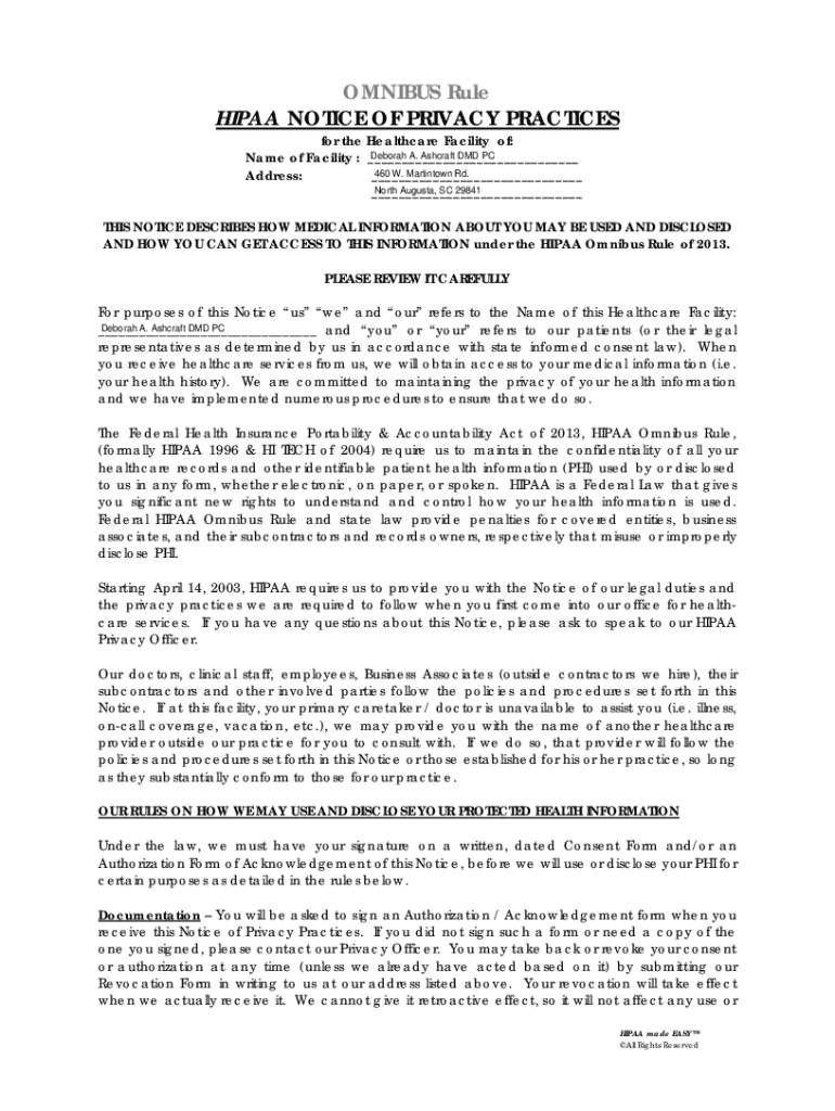 OMNIBUS Rule HIPAA NOTICE OF PRIVACY PRACTICES for the Healthcare Facility of: Deborah A. Ashcroft DMD PC Name of Facility : ___ 460 W. Martin town Rd. Address: ___ North Augusta, SC 29841 ___THIS
