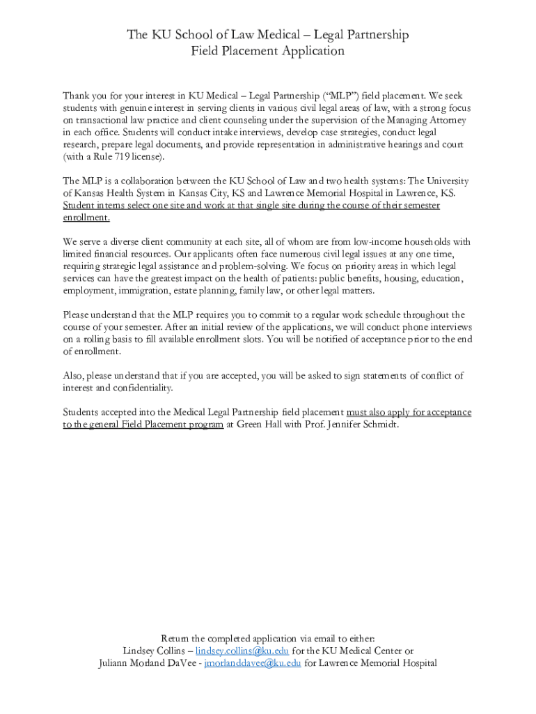 The KU School of Law Medical Legal Partnership Field Placement Application Thank you for your interest in KU Medical Legal Partnership (MLP) field placement. We seek students with genuine interest