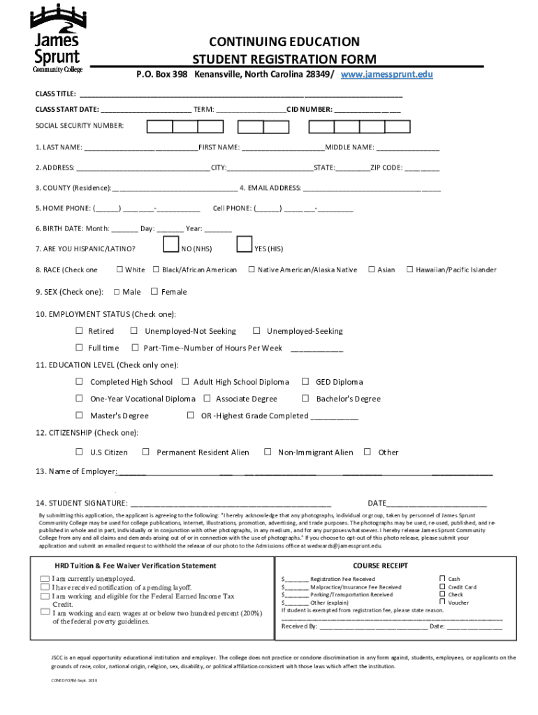 CONTINUING EDUCATION STUDENT REGISTRATION FORM P.O. Box 398 Evansville, North Carolina 28349/ www.jamessprunt.edu CLASS TITLE: ___ CLASS START DATE: ___ TERM: ___CID NUMBER: ___ SOCIAL SECURITY NUMBER:1.