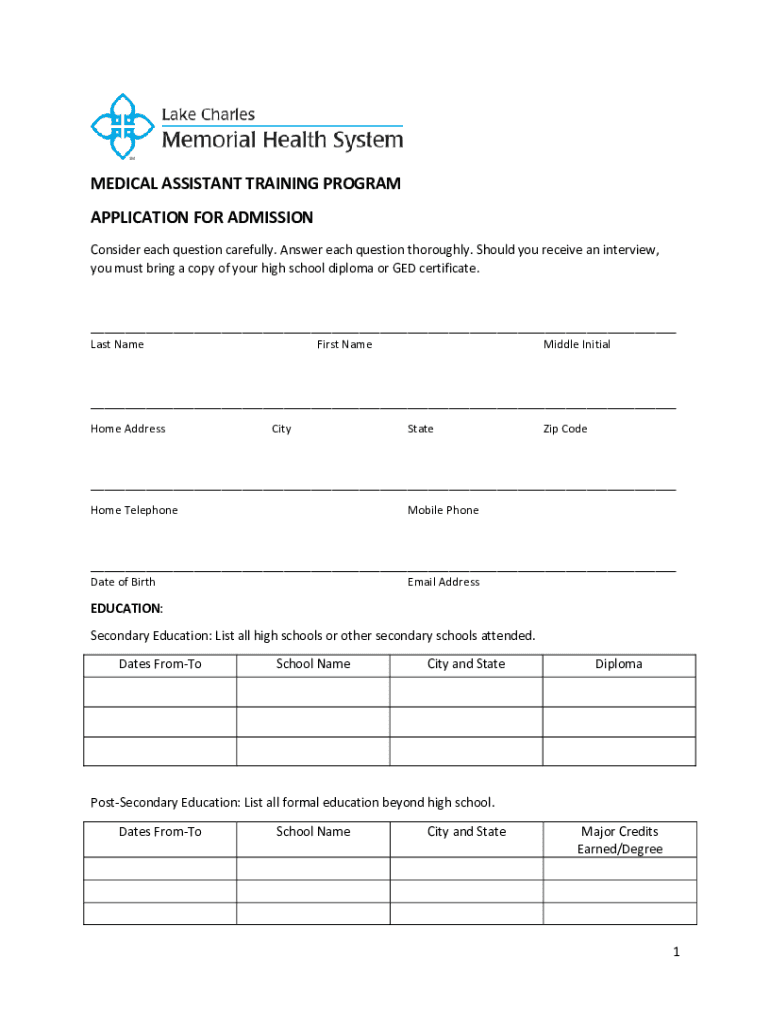 MEDICAL ASSISTANT TRAINING PROGRAM APPLICATION FOR ADMISSION Consider each question carefully. Answer each question thoroughly. Should you receive an interview, you must bring a copy of your high