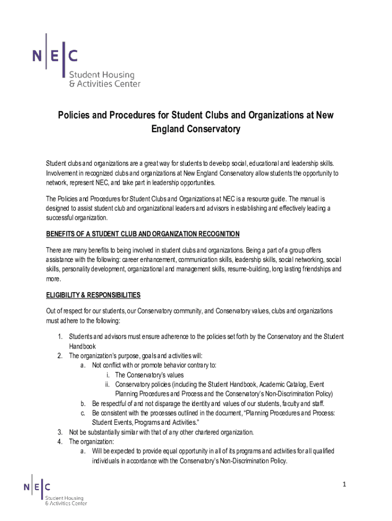Policies and Procedures for Student Clubs and Organizations at New England Conservatory Student clubs and organizations are a great way for students to develop social, educational and leadership skills.