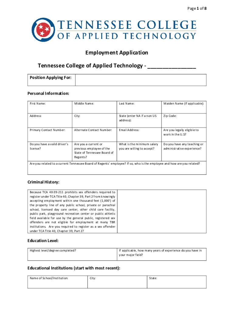 Page 1 of 8Employment Application Tennessee College of Applied Technology ___ Position Applying For: Personal Information: First Name:Middle Name:Last Name:Maiden Name (If applicable):Address:City:State