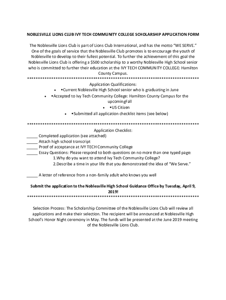 NOBLESVILLE×LIONS×CLUB×IVY×TECH×COMMUNITY×COLLEGE×SCHOLARSHIP×APPLICATION×Forth×Noblesville×Lions×Club×is part×of Lions×Club×International, ×and×has×the×motto×WE SERVE. One×of the×goals×of service×that×the×Noblesville×Club×promotes×is to×encourage×the×youth×Noblesville×to develop×to their×fullest×potential.×To further×the×achievement×of this×goal×Noblesville×Lions×Club×is offering×a $500×scholarship×to a worthy×Noblesville×High×School×senior