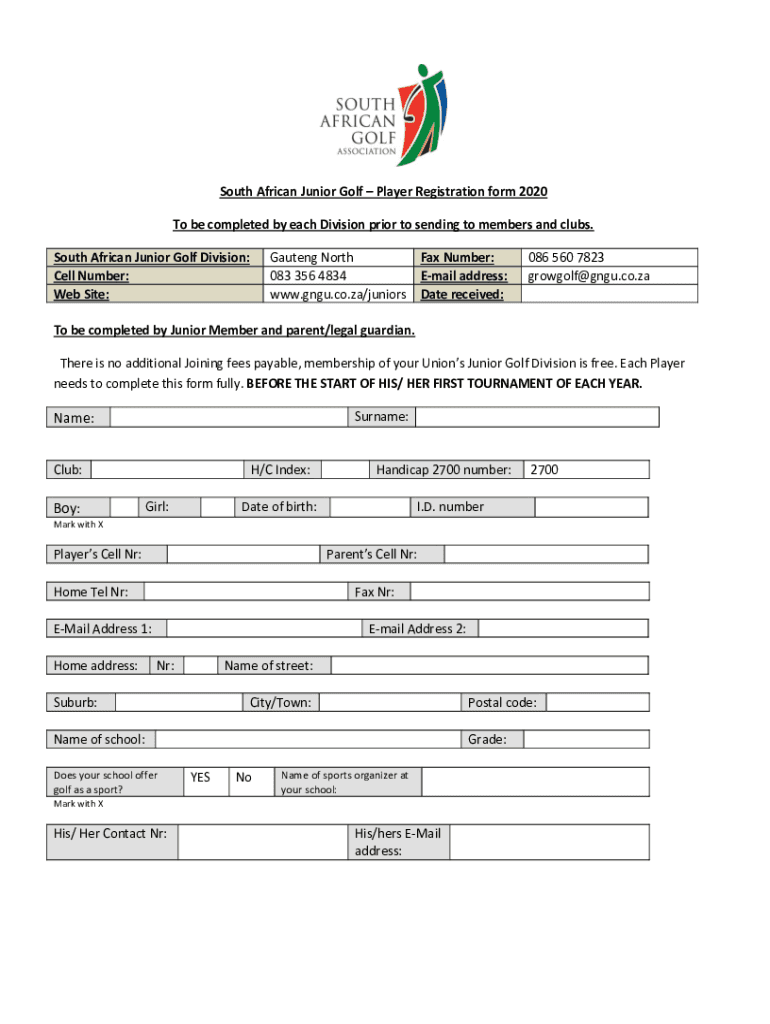 South African Junior Golf Player Registration form 2020 To be completed by each Division prior to sending to members and clubs. South African Junior Golf Division: Cell Number: Website:Gluten North
